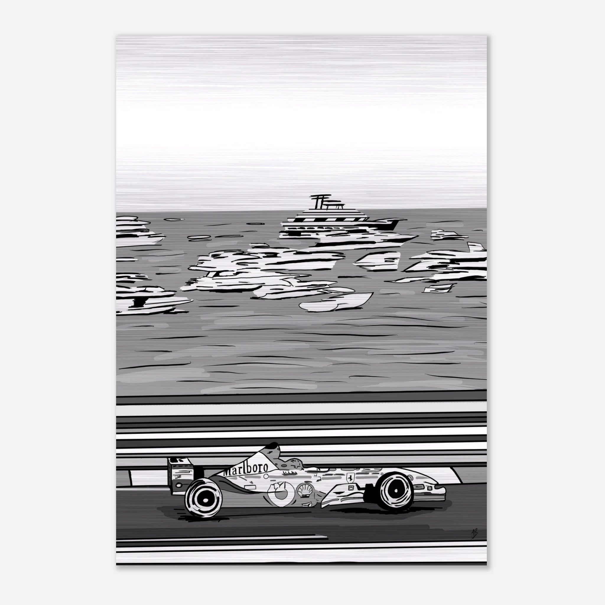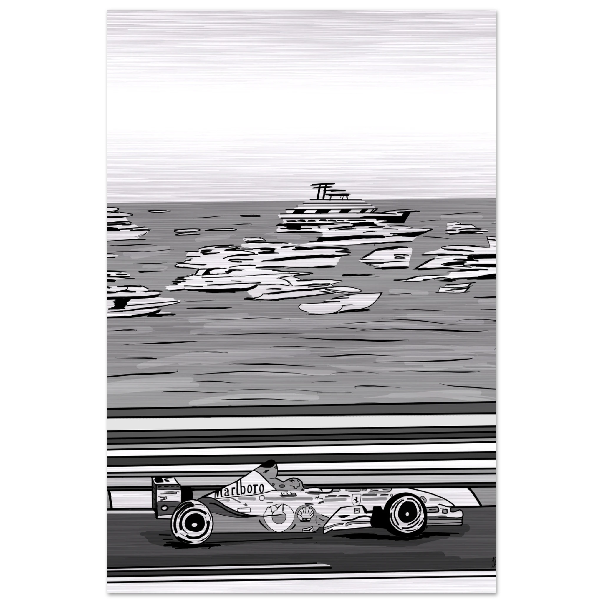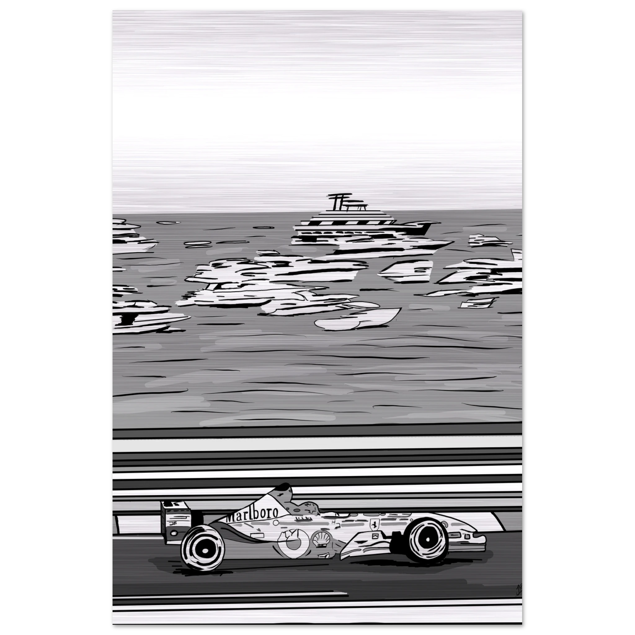 Ayrton Senna’s unmatched mastery of Monaco is immortalized in this striking black-and-white illustration. The legendary Marlboro McLaren car races past the grand steps and Mediterranean architecture, echoing the elegance and danger of Formula 1’s most prestigious circuit. This piece captures both the glamour of Monte Carlo and Senna’s relentless precision on its unforgiving streets — a true tribute to the King of Monaco.