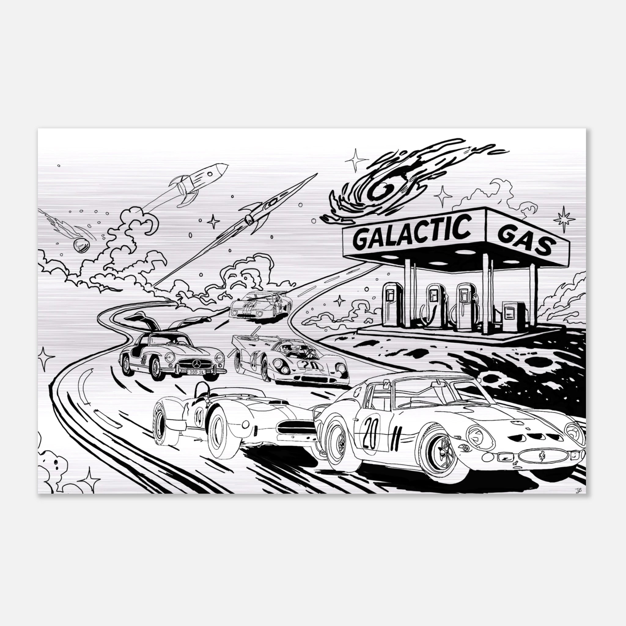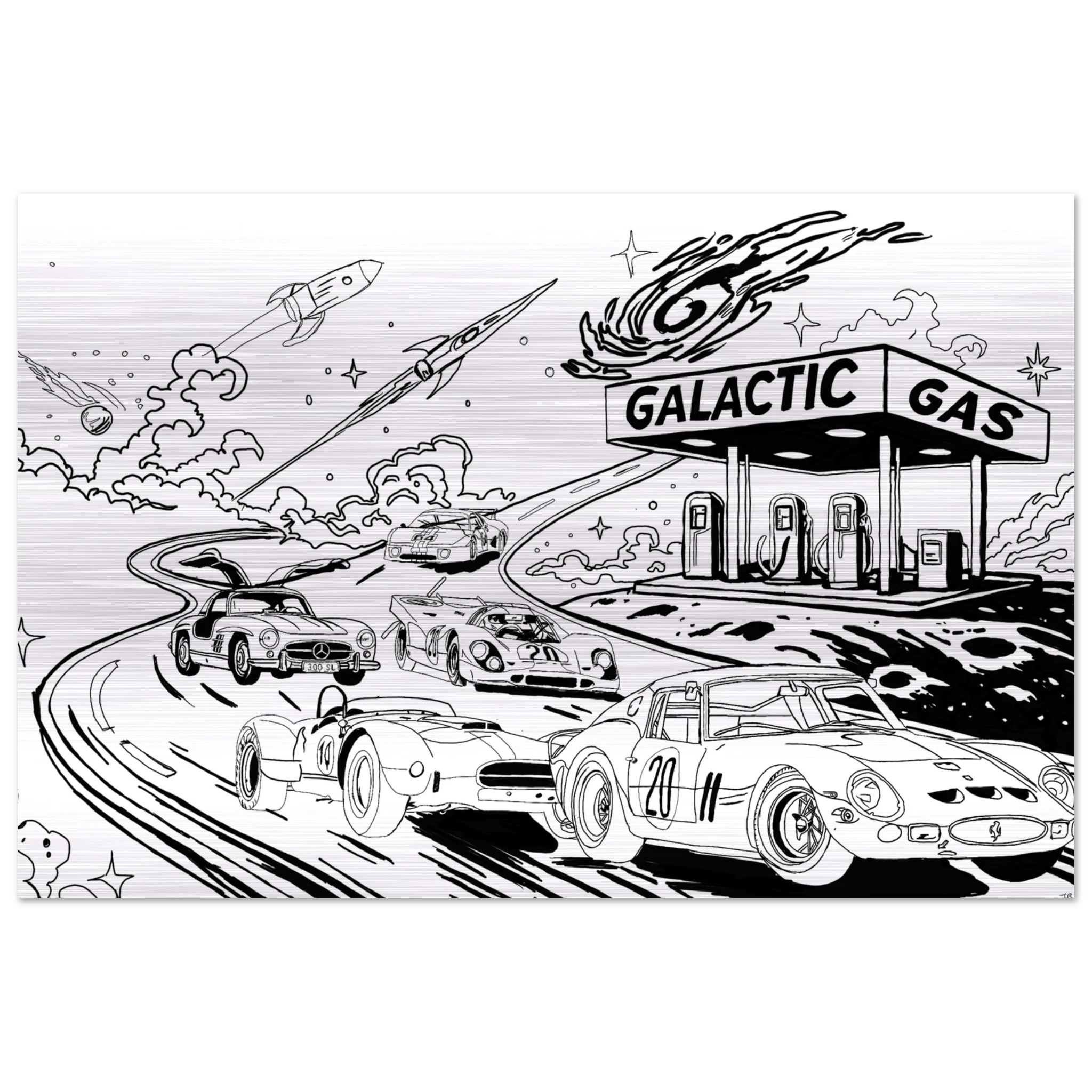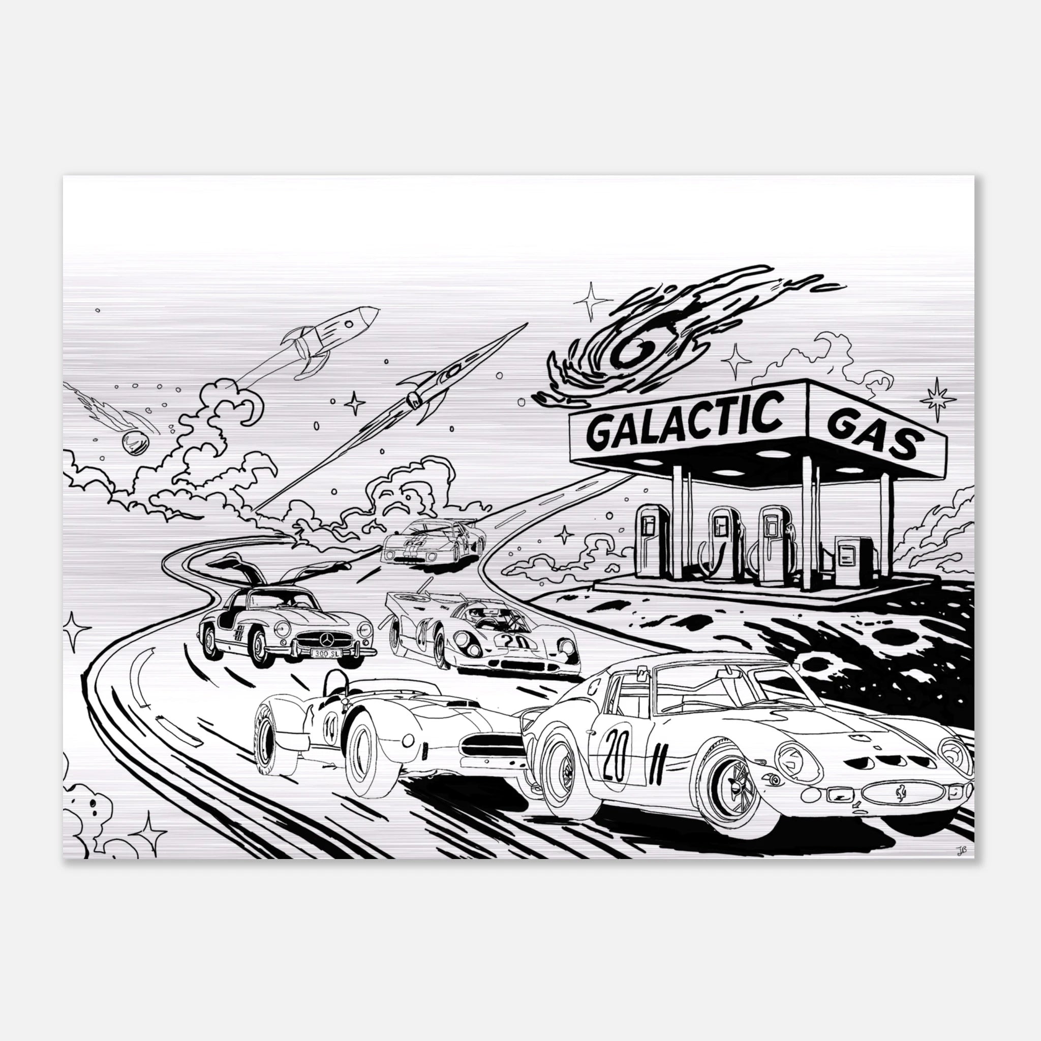 Printed on brushed silver aluminum, this edition gives the artwork a sleek, industrial edge. The metallic surface interacts with the bold lines to create depth and shimmer, transforming the gas station into a luminous, otherworldly landmark. Perfect for modern interiors, collectors of classic cars, and lovers of cosmic storytelling.