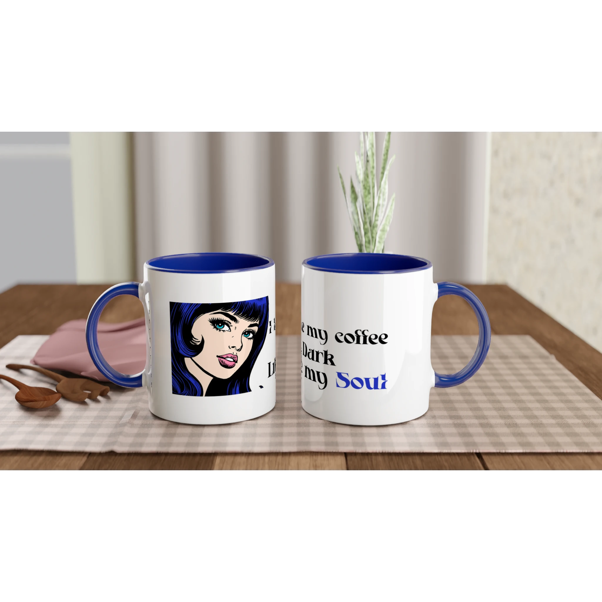 Start your mornings with a splash of humor and a dash of attitude. This glossy ceramic mug features a bold comic-style girl with jet-black hair and the cheeky text: “I like my coffee dark like my soul.”
