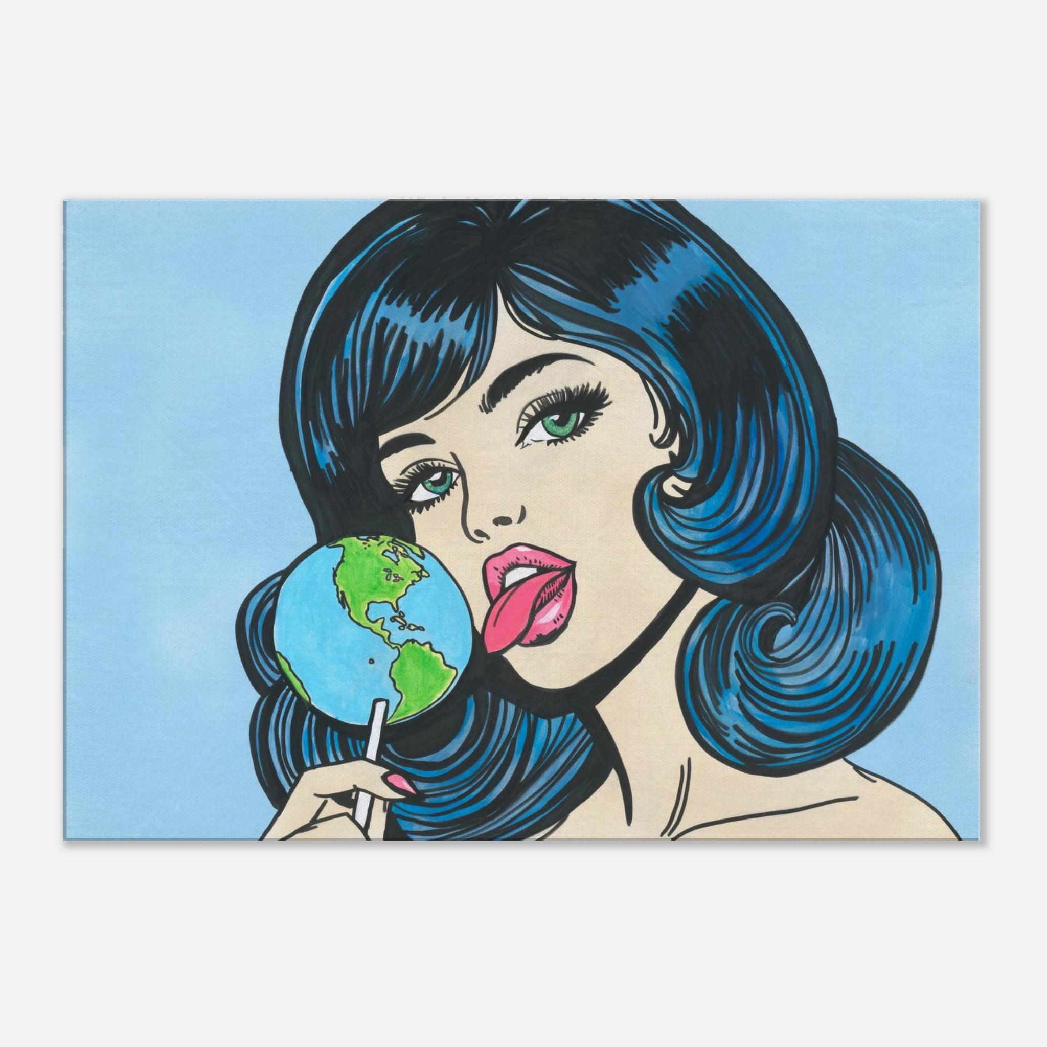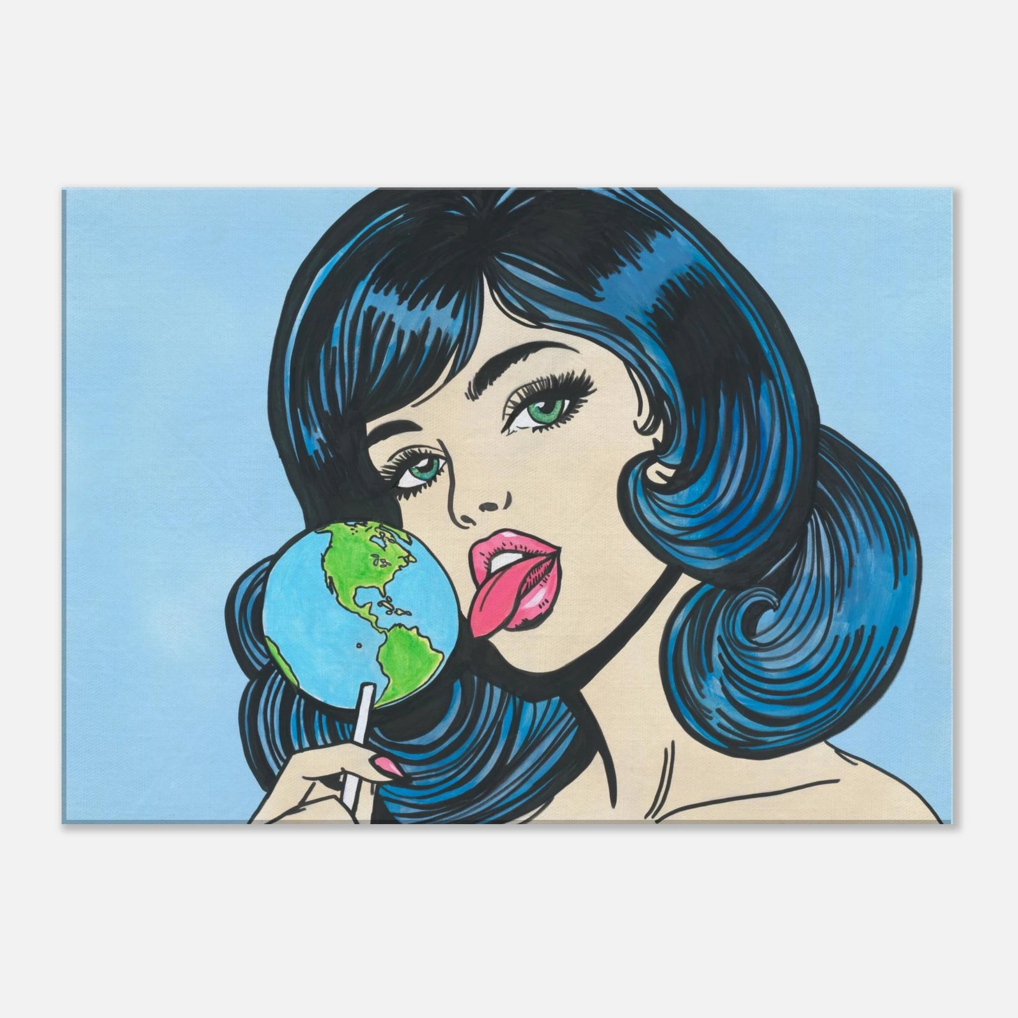 With bold comic-book flair, Earth Girl reimagines the world as a sweet indulgence — a lollipop in the hands of a cosmic beauty. Her playful pose, candy-colored palette, and retro pop-art style make this piece both cheeky and thought-provoking, a statement on culture, consumption, and desire.