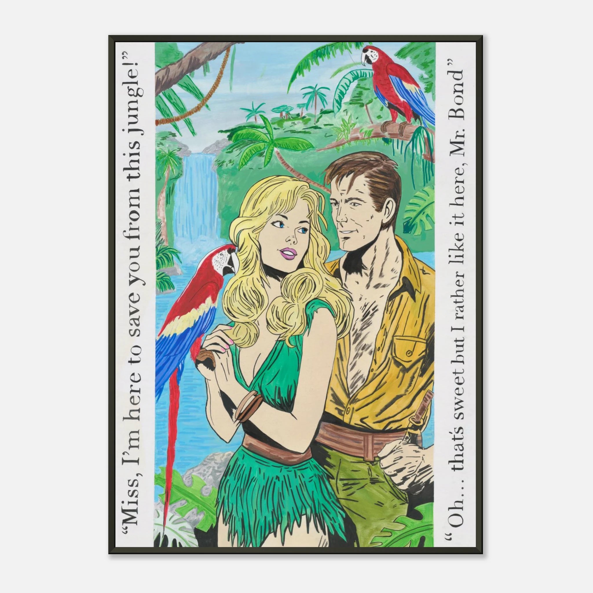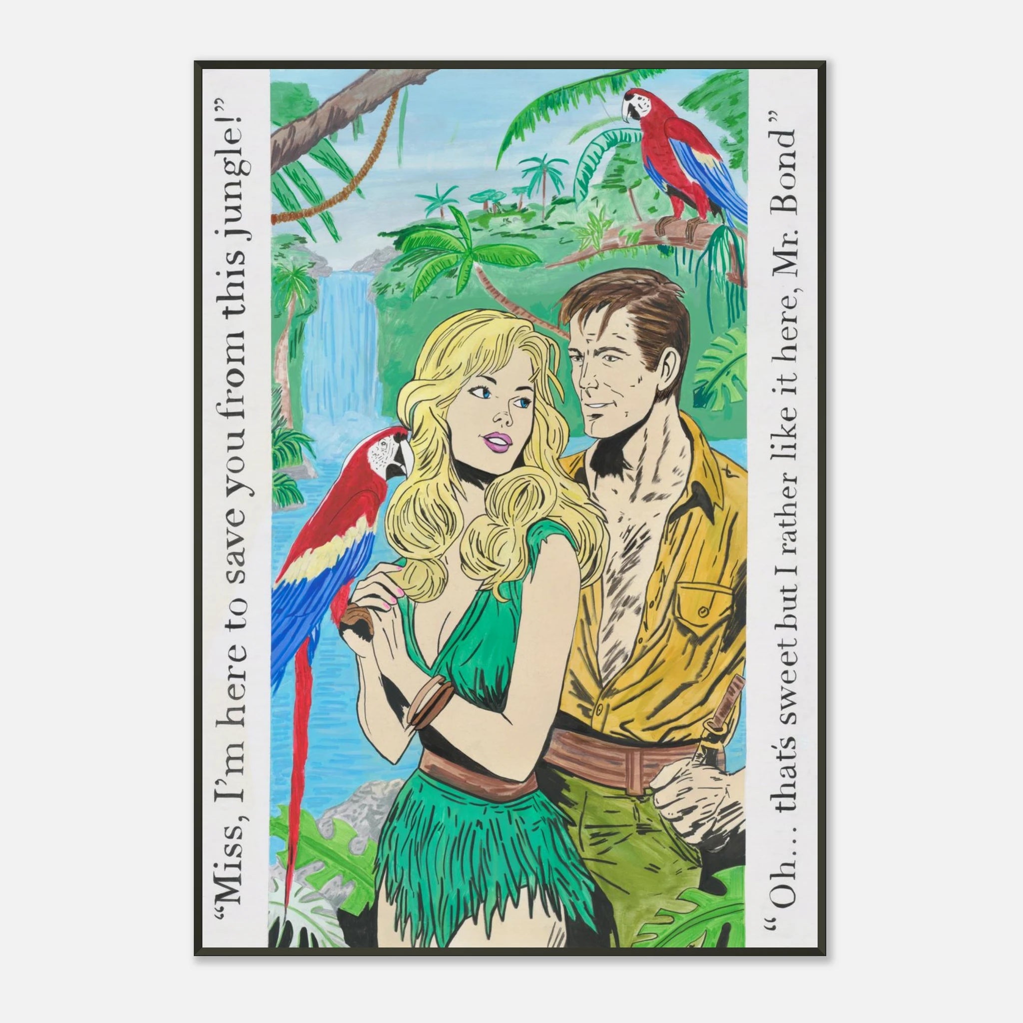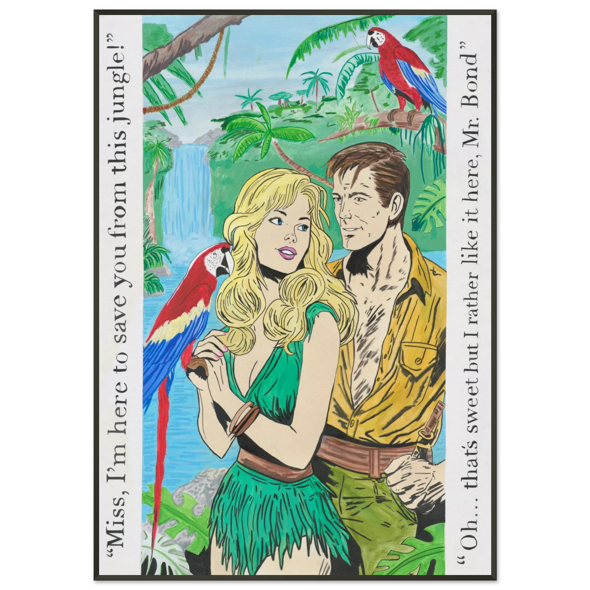 A playful parody of the classic James Bond romance, this artwork flips the script with a jungle adventure twist. Illustrated in comic-book style, it’s equal parts retro glamour and tongue-in-cheek satire, featuring a bold heroine who’s not so eager to be rescued.