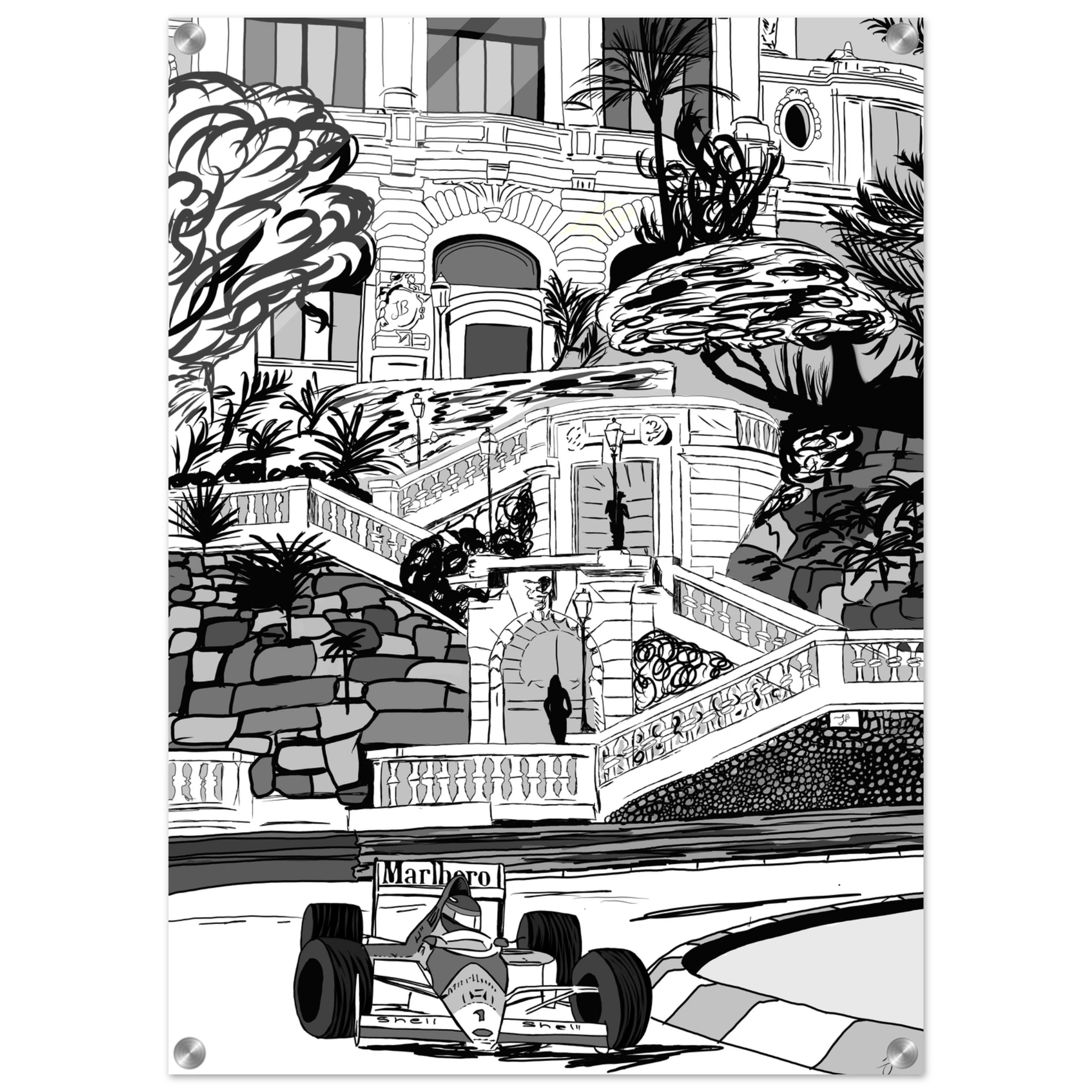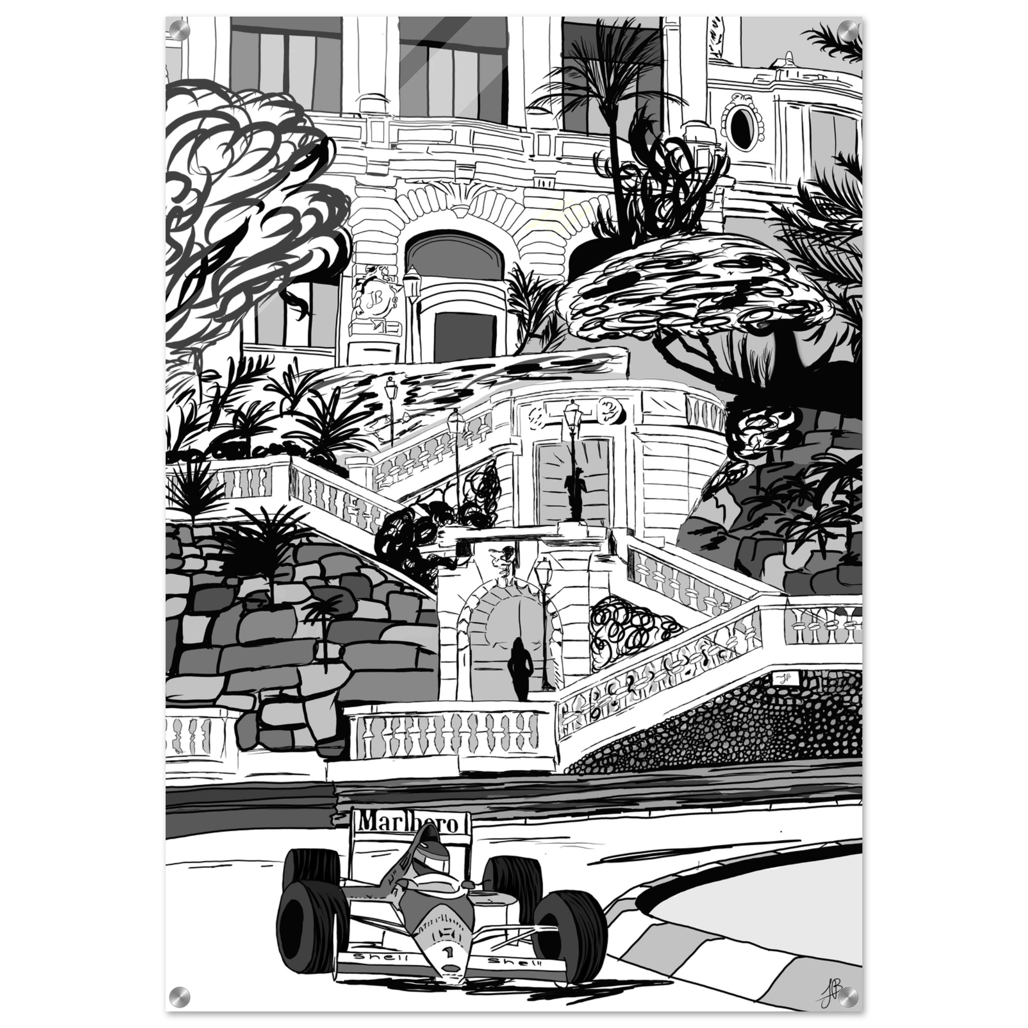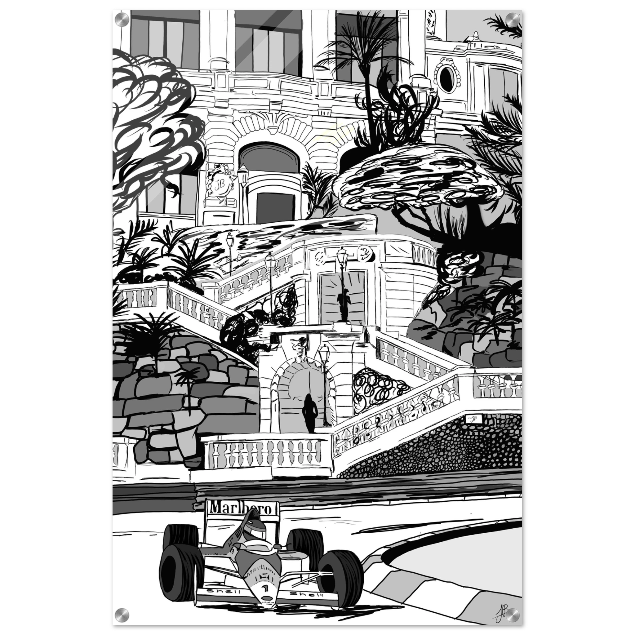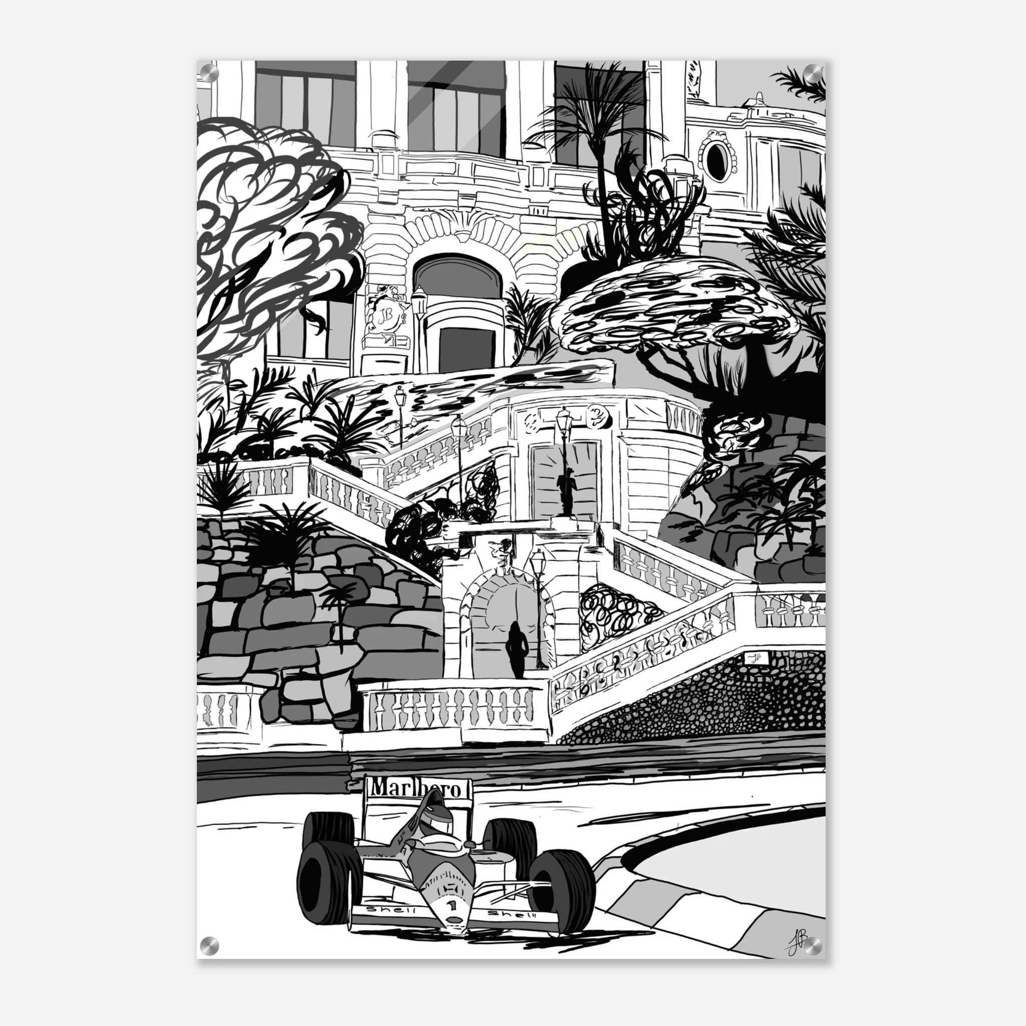 Ayrton Senna’s unmatched mastery of Monaco is immortalized in this striking black-and-white illustration. The legendary Marlboro McLaren car races past the grand steps and Mediterranean architecture, echoing the elegance and danger of Formula 1’s most prestigious circuit. This piece captures both the glamour of Monte Carlo and Senna’s relentless precision on its unforgiving streets a true tribute to the rain man as he was called for being the only driver to master the most difficult track in the world even in the worst conditions.