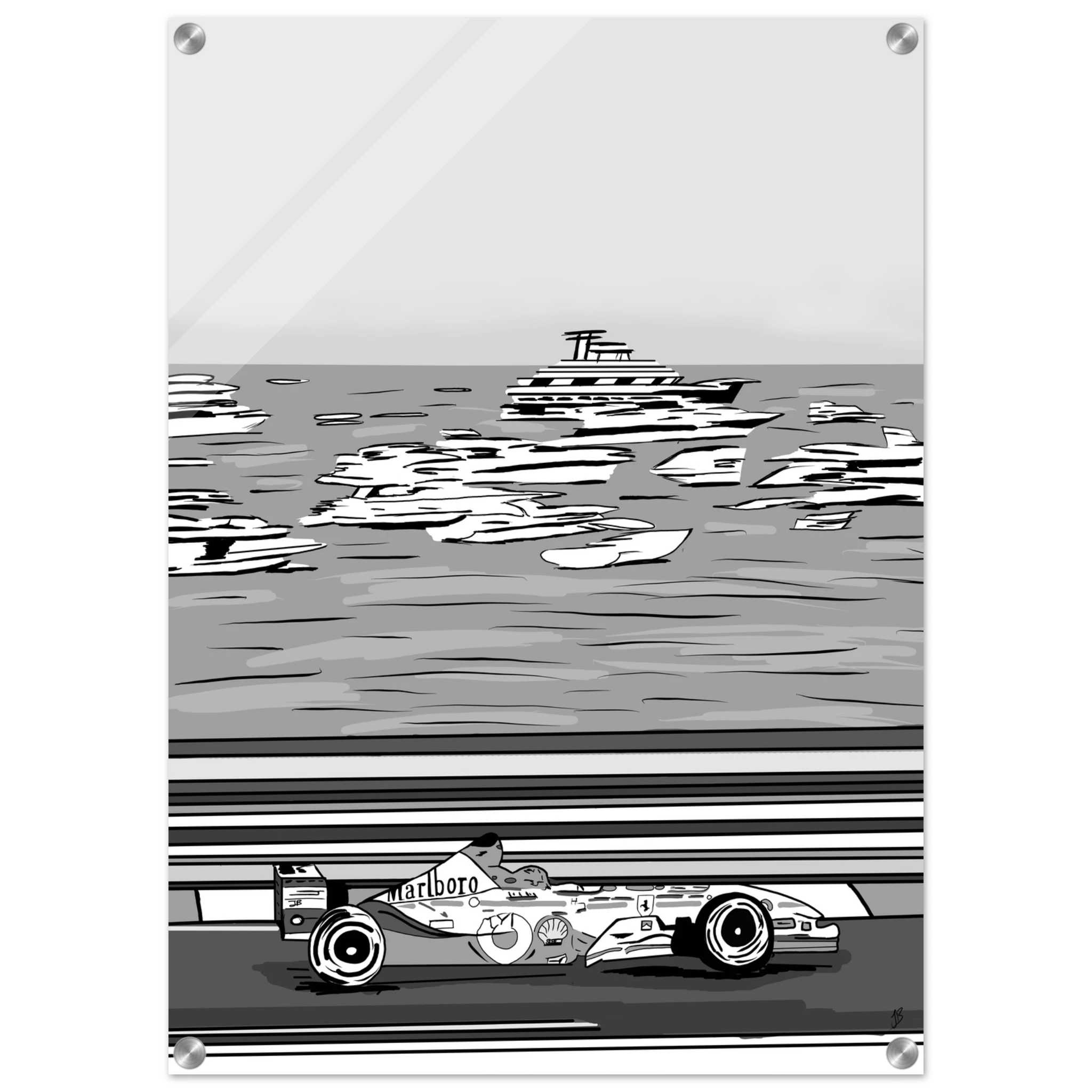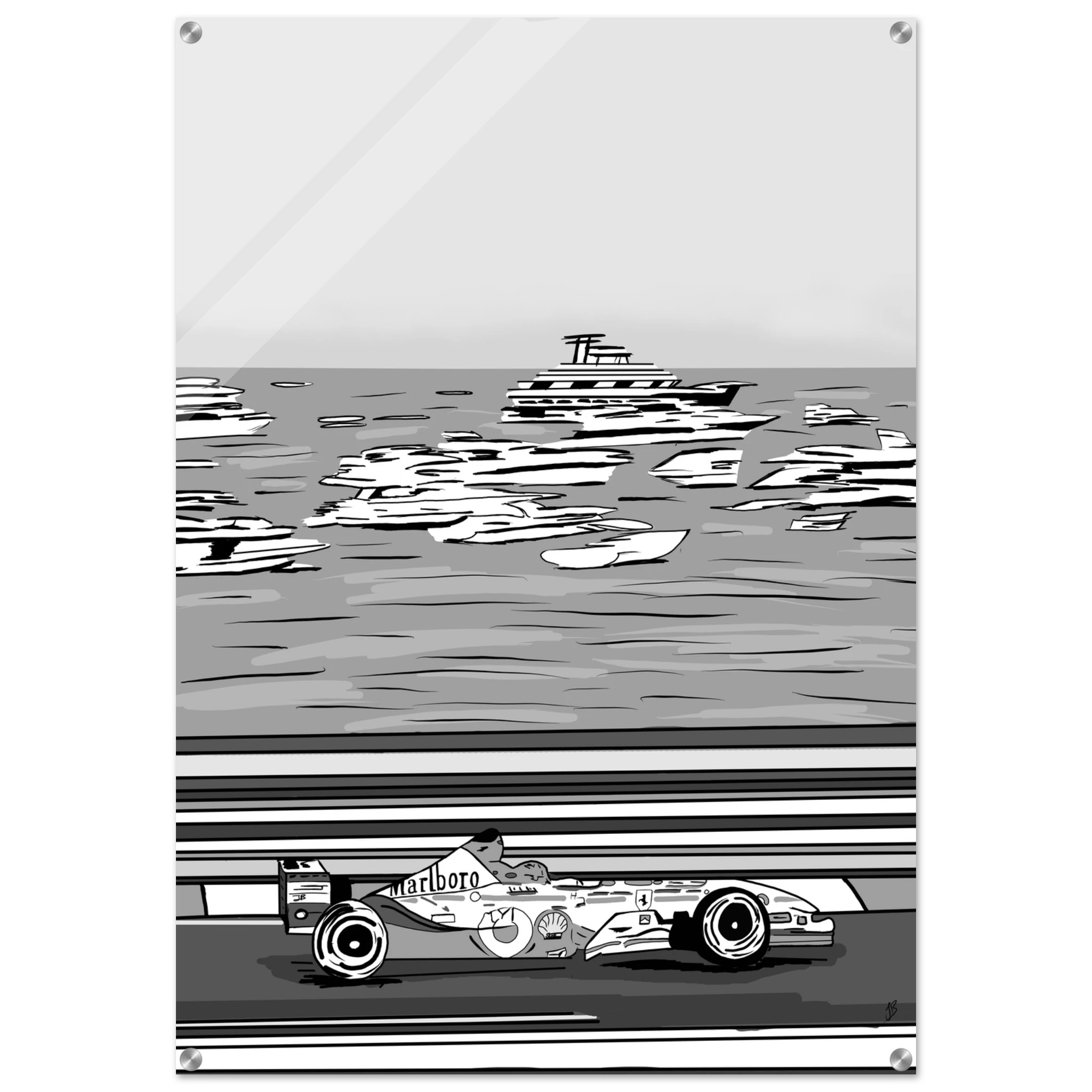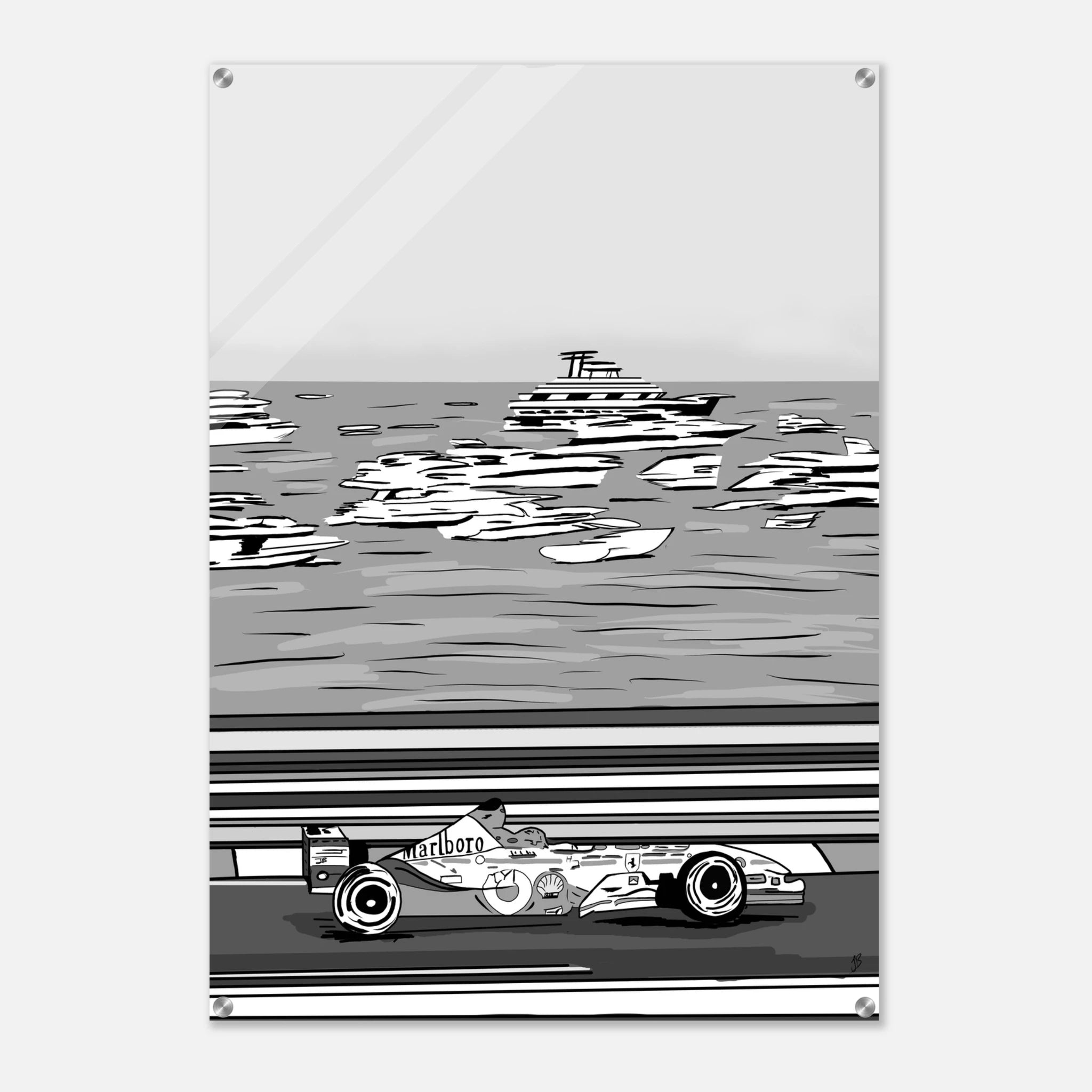 In this dynamic composition, Senna’s McLaren slices through the Monaco coastline, the car framed against the calm waters and luxury yachts of Monte Carlo. The contrast between speed and stillness mirrors Senna’s own duality — the warrior on track and the philosopher off it. A timeless celebration of motion, precision, and Ayrton’s unbreakable bond with the Principality of Monaco.