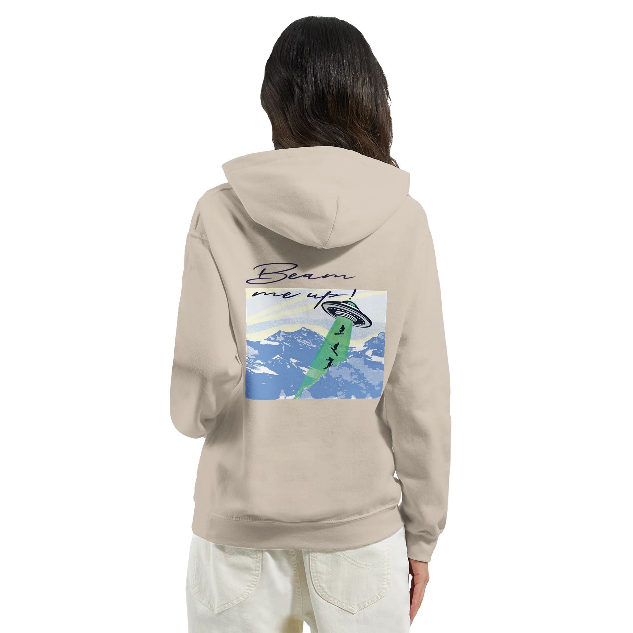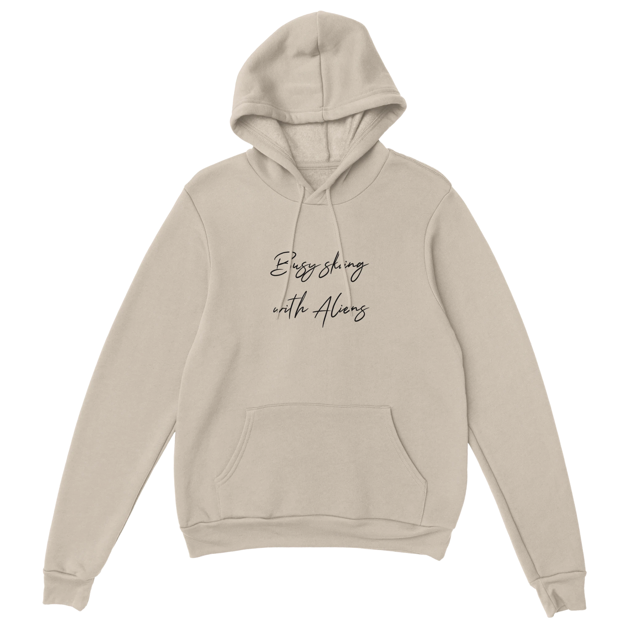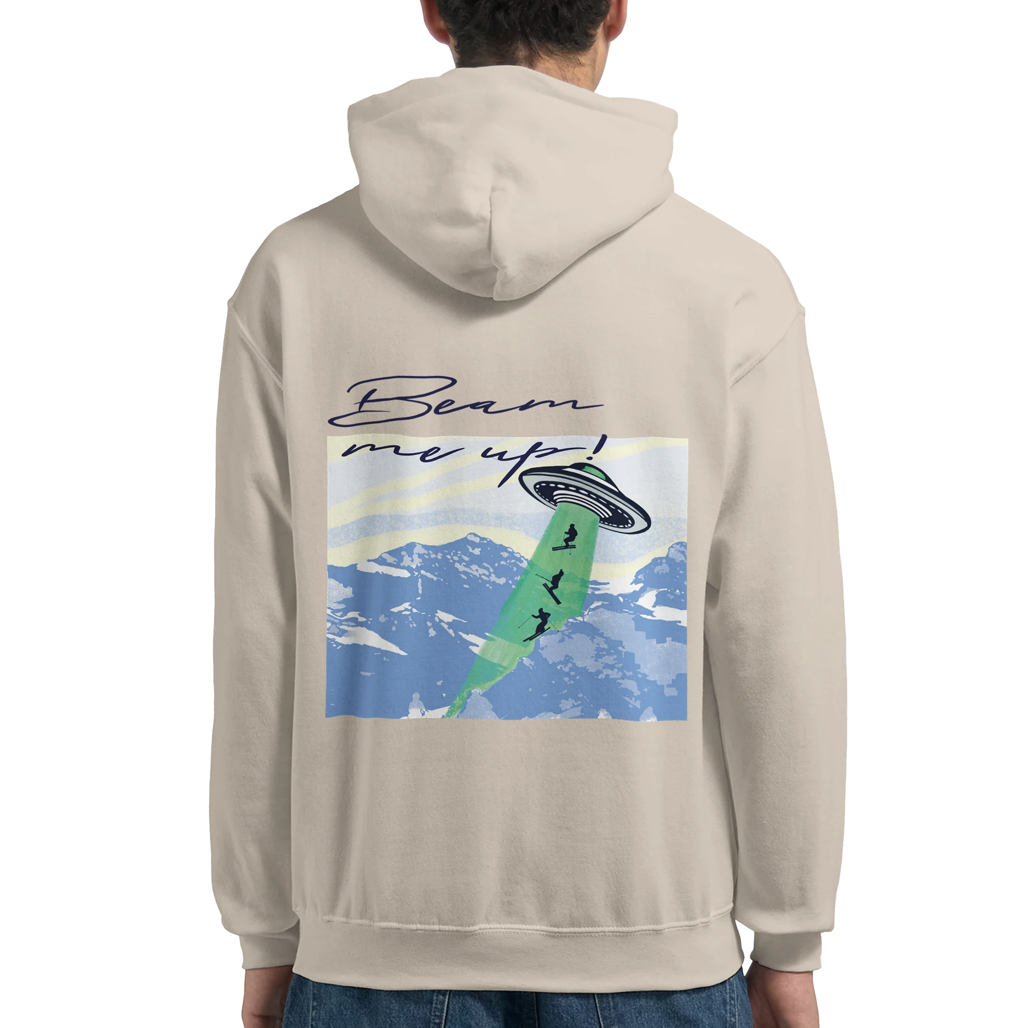 Busy skiing with Aliens hoodie, this hoodie is inspired by the alpine invasion collection and shows skiers being abducted by a UFO while skiing in the swiss alps.