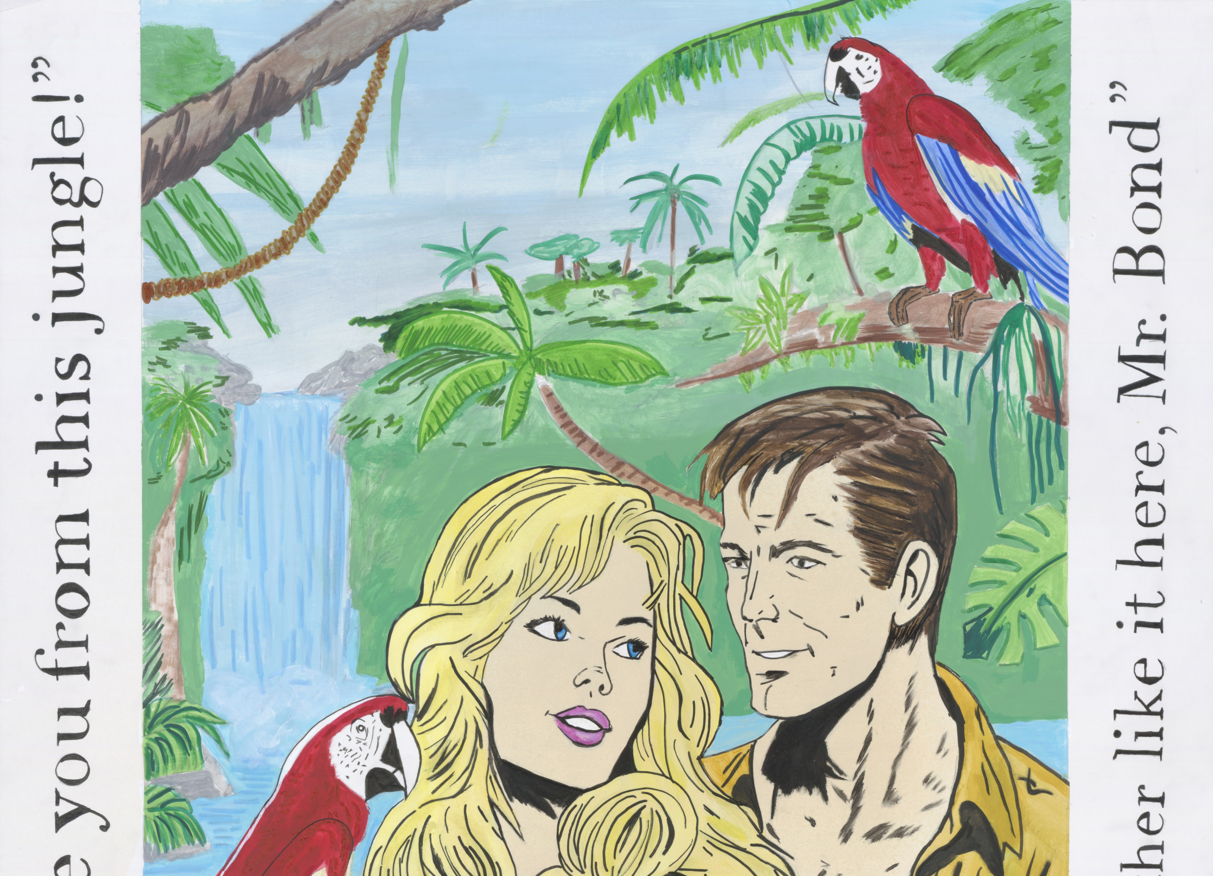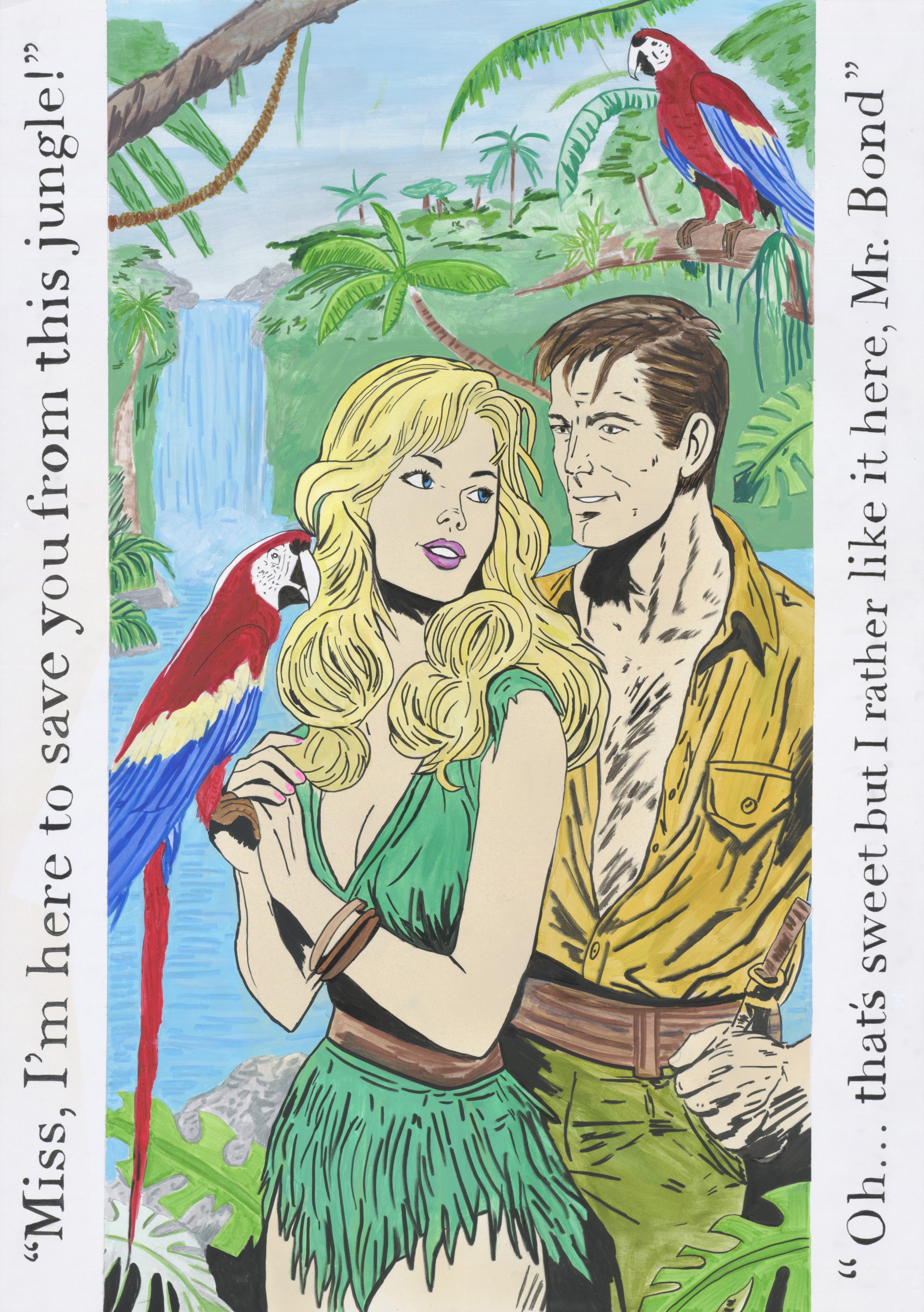 In this playful twist on the classic spy narrative, I Rather Like It Here, Mr. Bond turns the trope of the damsel in distress on its head. Part of a three-piece James Bond–inspired series, the artwork captures the moment 007 arrives—suave, ready to rescue—only to be met with a cool smile and the line: “That’s sweet, but I rather like it here, Mr. Bond.”